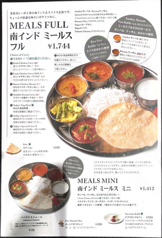 本ブログでも「【参考】ミールスの食べ方」で紹介しているのがエリックサウス(東京・八重洲)のHPです。カレー通でこのお店を知らない人はいない位に有名ですが、八重洲本店が2011年に営業開始と知ると、意外に新しいと思われるかもしれません。